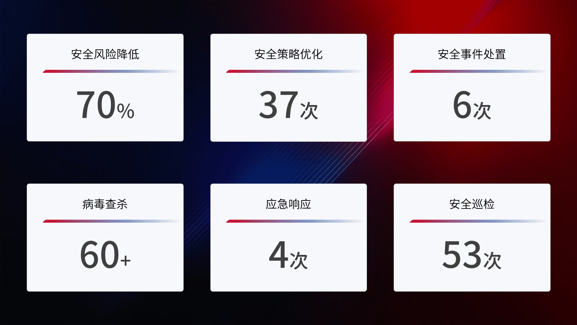 提供全面的安全事件报告体系,,包括处置报告、、、周报、、、季度和年度总结,,,结合持续监控,,,帮助客户深入了解网络安全状况。。。